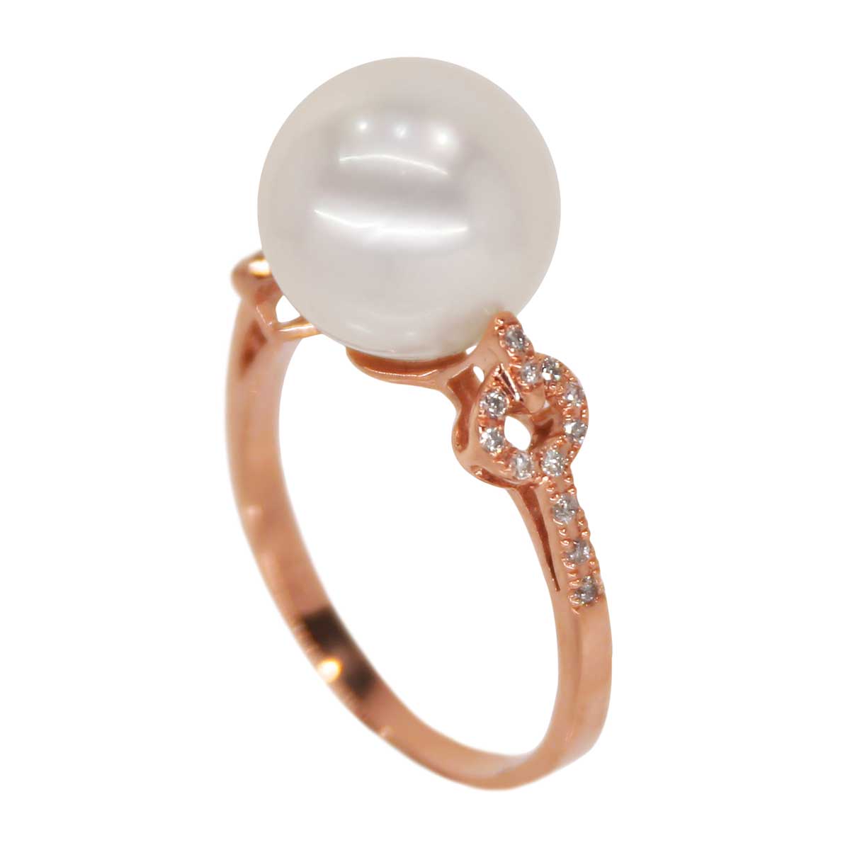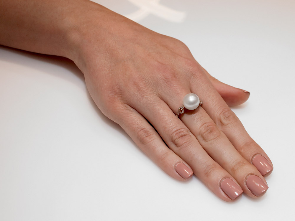 Ένα λαμπερό Δαχτυλίδι συνδυασμένο με άψογο Μαργαριτάρι Νοτίων Θαλασσών και μαγευτικά καφέ Διαμάντια σε κοπή μπριγιάν, πάνω σε 18Κ ροζ χρυσή βάση.
