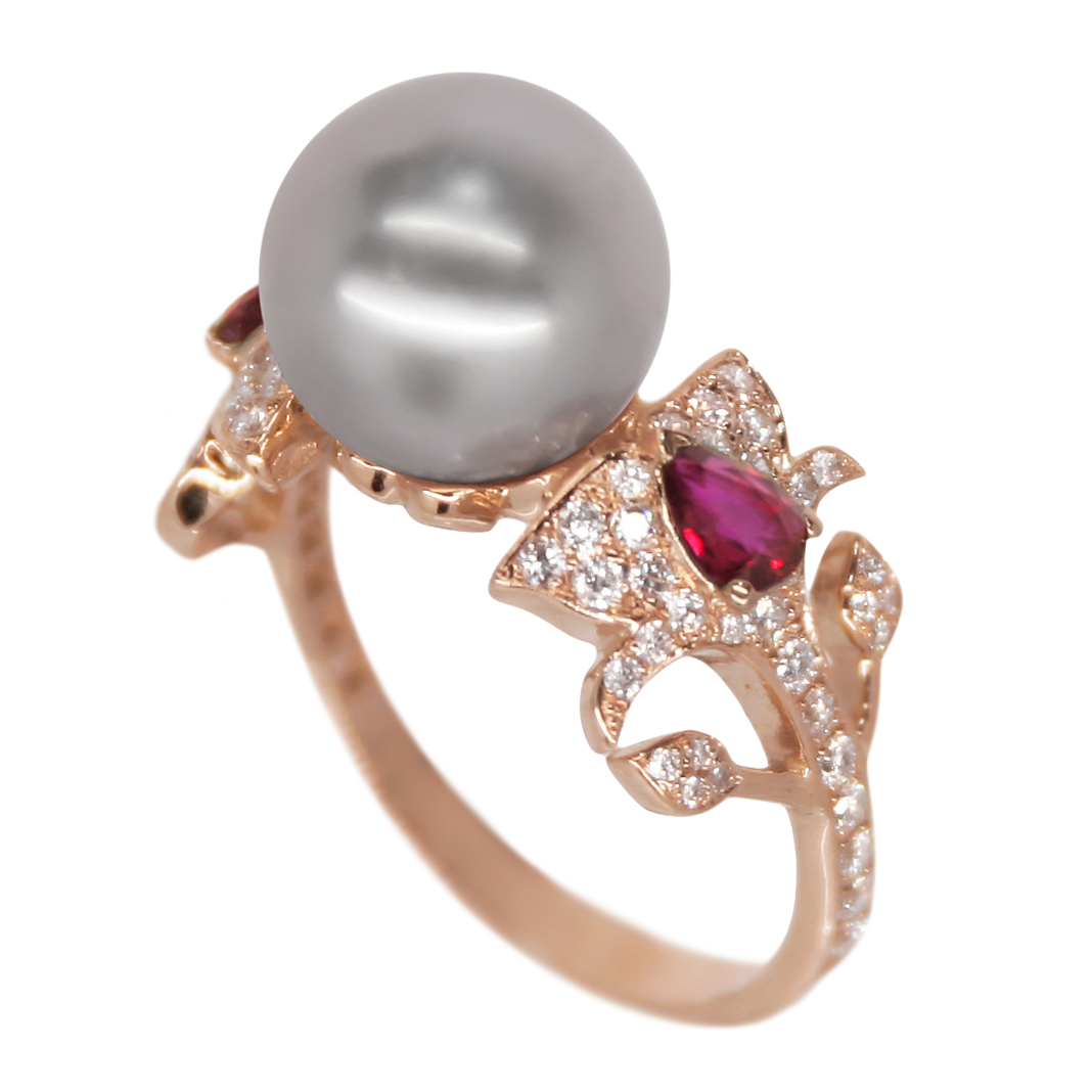 Ένα Δαχτυλίδι σε βυζαντινό σχέδιο από ροζ χρυσό 18Κ με γοητευτικά καφέ Διαμάντια σε κοπή μπριγιάν, σε έναν ιδανικό συνδυασμό με αισθησιακά Ρουμπίνια και λουστράτο Μαργαριτάρι Ταϊτής σε φυσικό μαύρο χρώμα.