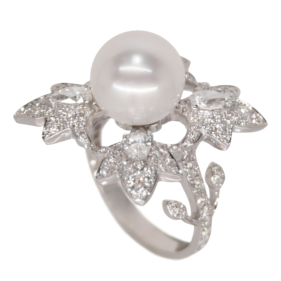 Ενα πανέμορφο Δαχτυλίδι με Βυζαντινό σχέδιο απο λευκόχρυσο 18Κ με ακτινοβόλα Διαμάντια σε κοπή μπριγιάν, σε έναν ιδανικό συνδυασμό με γυαλιστερό Μαργαριτάρι Ακόγια Ιαπωνίας.