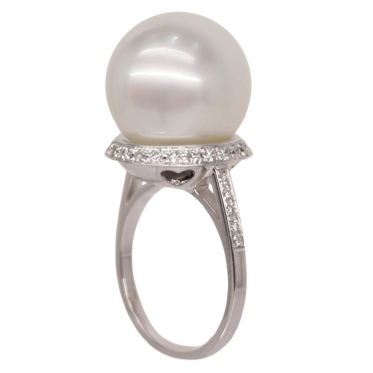Ένα πολυτελές Δαχτυλίδι με εξαιρετικό Μαργαριτάρι Νοτίων Θαλασσών και αστραφτερά Διαμάντια σε κοπή μπριγιάν, τέλεια εφαρμοσμένα σε λευκόχρυσο 18Κ με ενα διακριτικό και σικάτο ύφος.